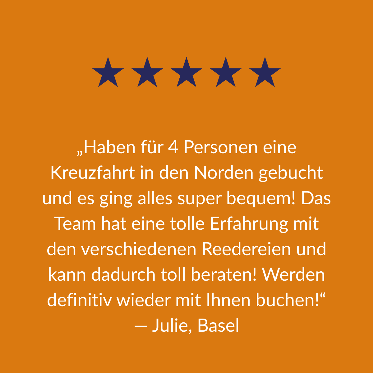 Wir lieben das Meer, das Reisen und den direkten Draht zu unseren Kund:innen. Als kleines, spezialisiertes Online-Unternehmen verbinden wir langjährige Branchenerfahrung mit einem modernen, flexiblen Arbeitsstil. Bei uns bekommen unsere Kunden keine Massenabfertigung, sondern ehrliche Beratung, echte Begeisterung – und Kreuzfahrten, die zu Ihnen passen.