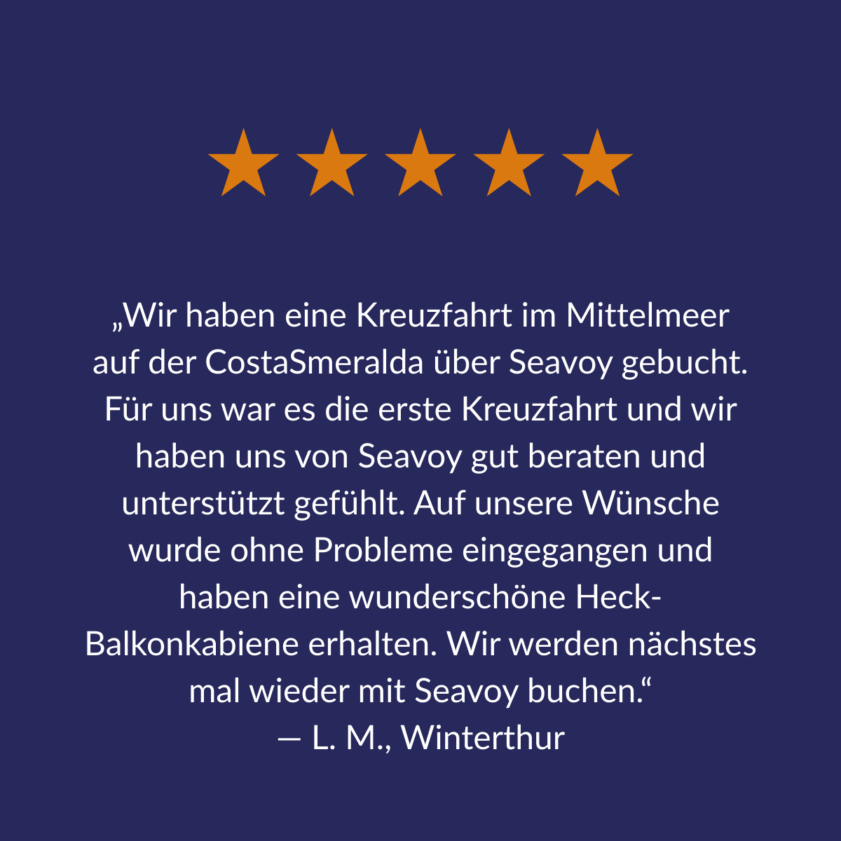 Gönnen Sie sich mehr als nur eine Reise und lesen Sie, wie unsere Gäste ihre besonderen Kreuzfahrterlebnisse mit SEAVOY beschreiben.